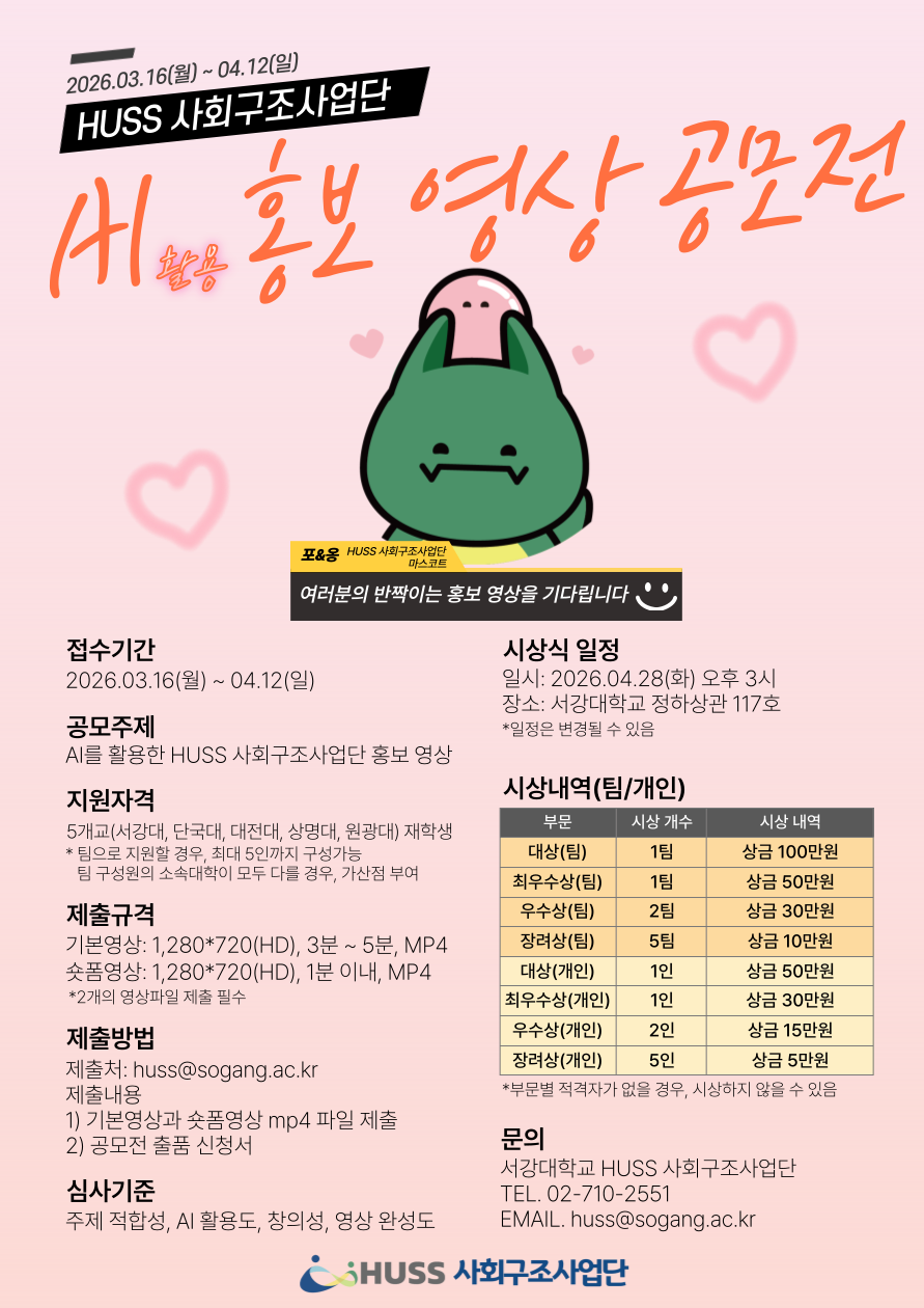 | 상명 [비교과] | [HUSS 인문사회융합인재양성사업단] 'HUSS 사회구조사업단 AI 활용 홍보 영상 공모전' 안내 |