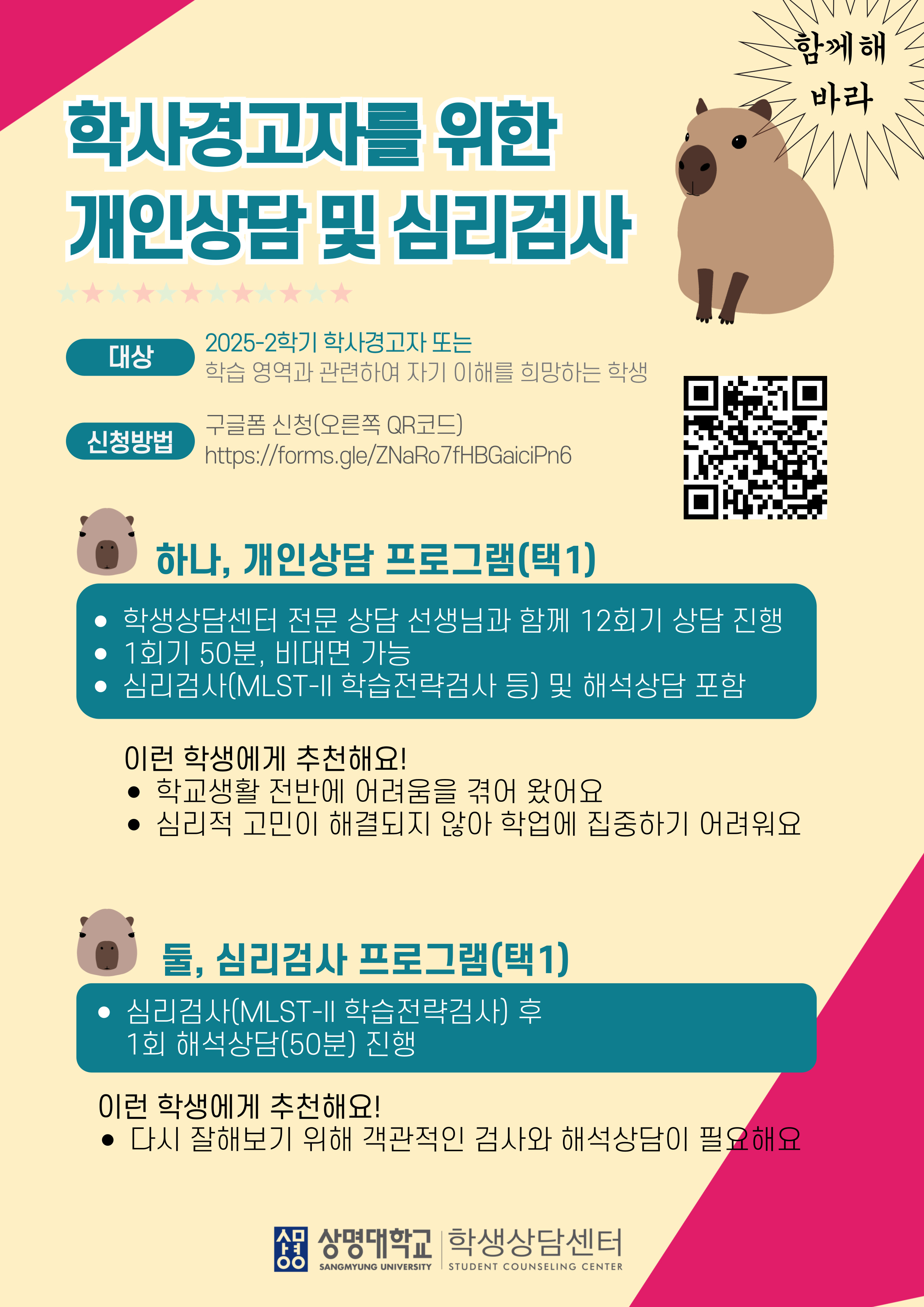 | 서울 [학생생활] | [학생상담센터(서울)] 25-2 학사경고자를 위한 개인상담 및 심리검사 안내 |