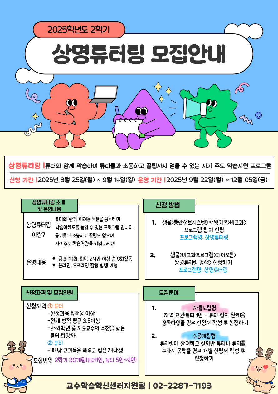| 서울 [비교과] | [교수학습혁신센터지원팀(서울)] 2025학년도 2학기 상명튜터링 모집 연장 안내(~9월14일) |