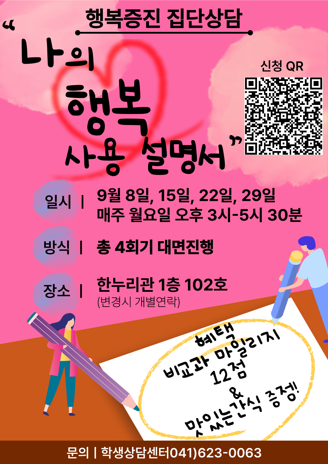 | 천안 [학생생활] | [학생상담센터] 25-2 행복증진 집단상담 <나의 행복사용설명서> |