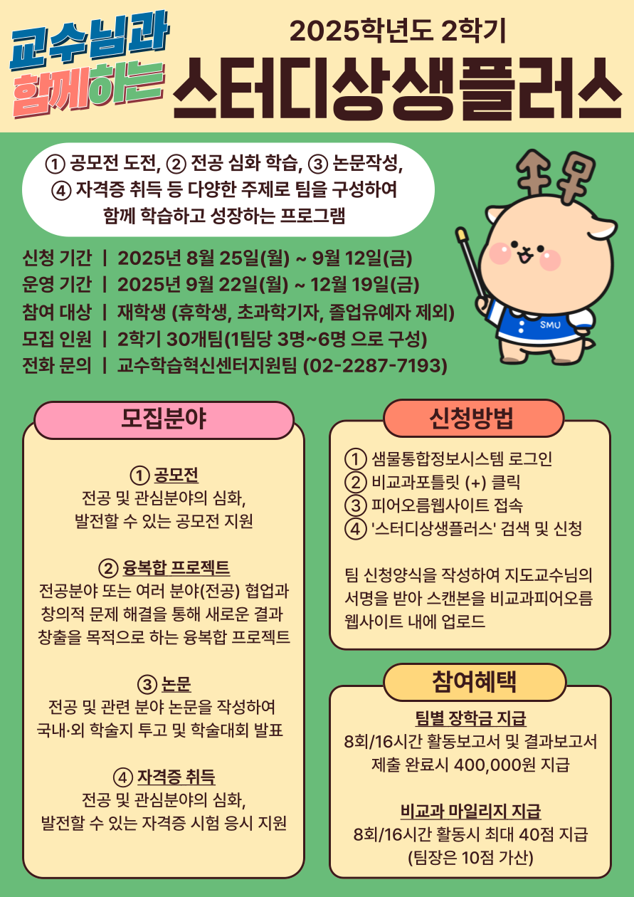 | 서울 [비교과] | [교수학습혁신센터지원팀(서울)]2025학년도 2학기 스터디상생플러스 모집 안내 |