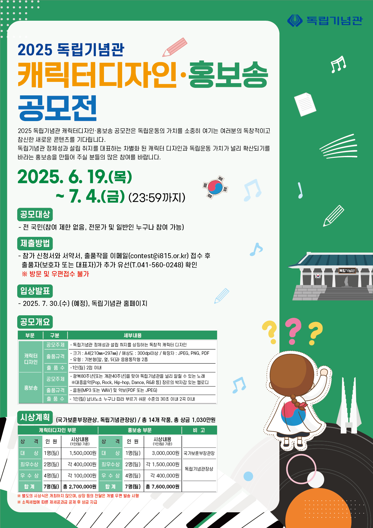 | 천안 [일반] | [공모 안내] 2025 독립기념관 캐릭터디자인/홍보송 공모전 |