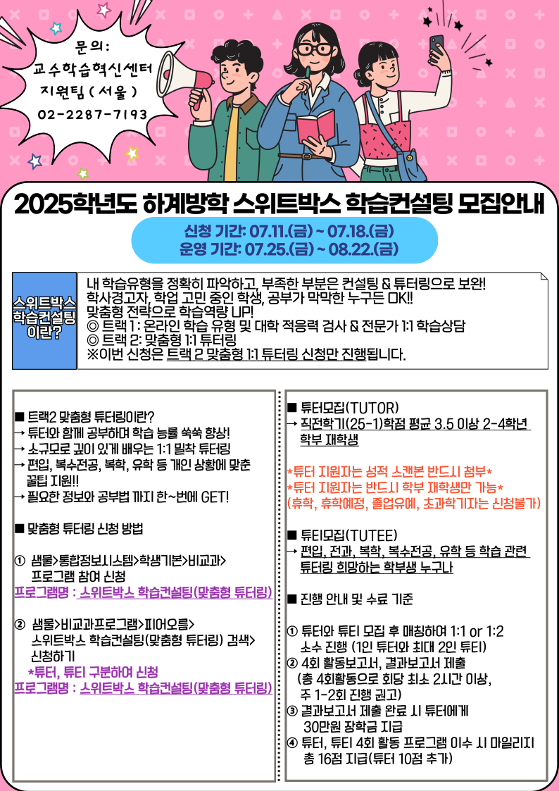 | 서울 [비교과] | [교수학습혁신센터지원팀(서울)]2025학년도 하계방학 스위트박스 학습컨설팅_트랙2 맞춤형 1:1 튜터링 모집 안내 |