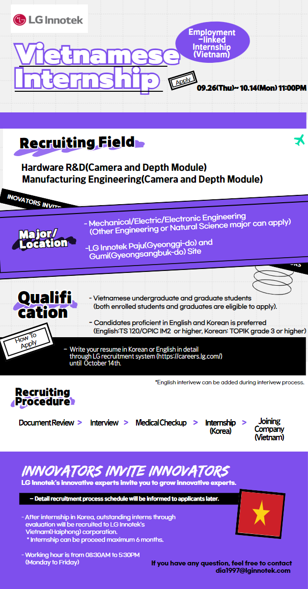 - [취업 및 진로] [LG이노텍] 베트남 유학생 인턴십 모집(~10/14)
